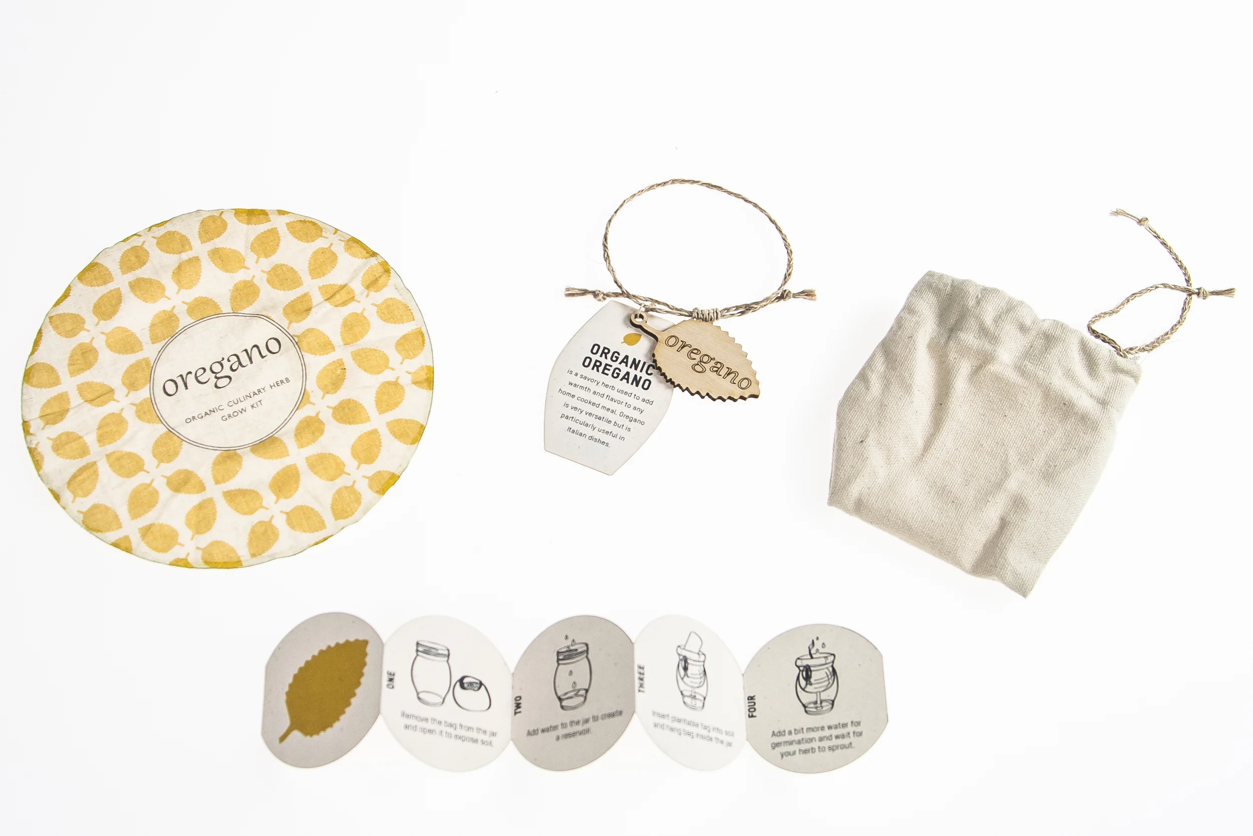 • Printed fabric jar cover • Plantable tag • Lasercut wood tag • soil bag • Instruction booklet